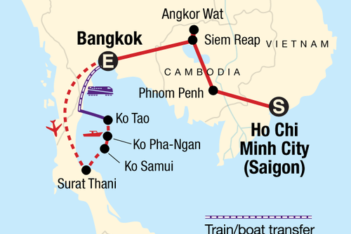Begin in bustling Ho Chi Minh City then make your way to Phnom Penh and the incredible ancient temple complex of Angkor Wat. Stop by the Thai capital of Bangkok before heading south to the islands for swimming, relaxing, snorkelling, and maybe even a full moon party if your timing is right.