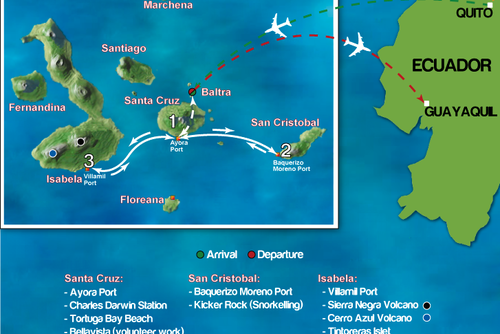- Boat trip to Las Tintorera Islet to snorkel & hike, observing penguins, iguanas, reef sharks, sea lions and birds.