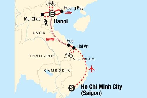 Highlights of this tour include going cycling in the Vietnamese countryside, kayaking in Halong Bay, trekking in Mount Chau and exploring cities and towns along the way. This tour starts in Ho Chi Minh City and finishes in Hanoi.