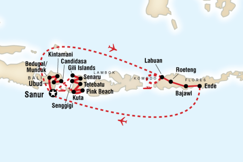 Hop on a plane to Labuan Bajo, a small fishing village on the island of Flores. Wander the town and check out the beaches and watch for flying fox bats at dusk. On Day 3, enjoy a full-day trip by boat to Rinca Island and Komodo Island nearby. Walk through the grasslands looking for Komodo dragons in their natural habitat. Head back to Labuan Bajo for the evening.