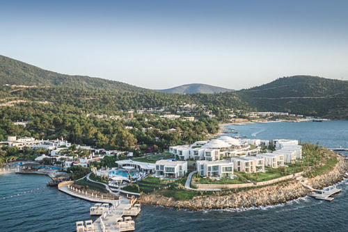Spanning over 40,000 square meters of the peninsula, the property offers unparalleled views of the clear blue Torba Bay, the Aegean Sea and nearby islands. Designed to blend into its natural surroundings, the property merges modern contemporary features to local details and materials.