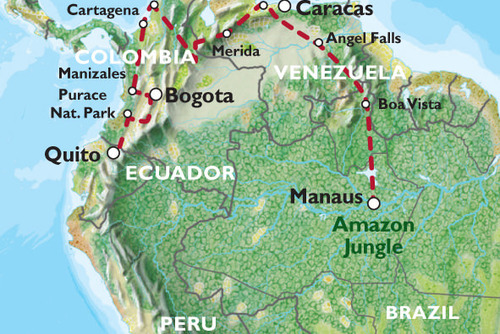 Explore Caribbean beaches and the wildlife filled wetlands of the Llanos, before taking in a few adrenaline activities in Merida. Enjoy the cobbled streets and colonial architecture of Cartagena and the vibrant nightlife of Bogota, travelling south down the back of the Andes through coffee plantations to the colourful markets of Otavalo and our final destination of Quito - the gateway to the Galapagos.